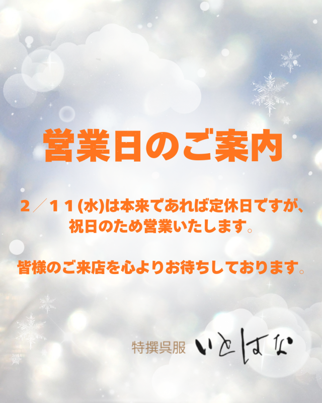 2/11(水)は祝日のため通常通り営業しておりますので、